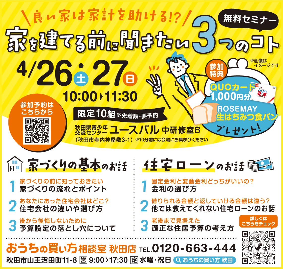 【良い家は家計を助ける⁉︎ 家を建てる前に聞きたい3つのコト】と題して、4月26日(土)・4月27日(日)の二日間を予定。