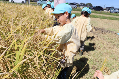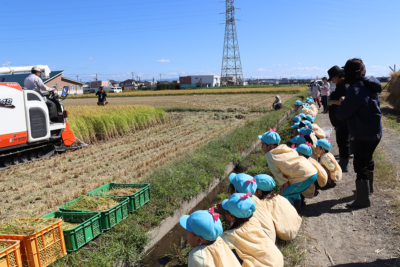 稲穂を実際に触るのは初めてという園児たちも多く、使い慣れたはさみで刈り取ったあとは、大きな「コンバイン」での稲刈りの様子を見学しましたよ。