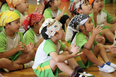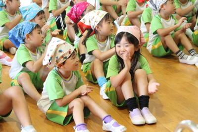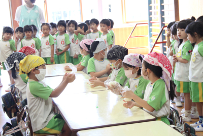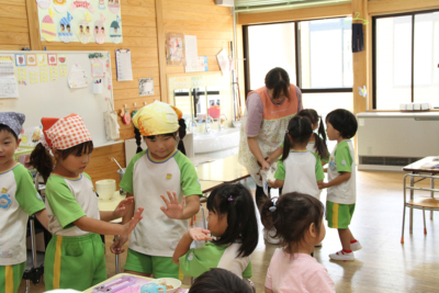稲刈りの様子をクイズで思い出したあと、おにぎりの作り方も再確認。手遊び歌でも練習しました。