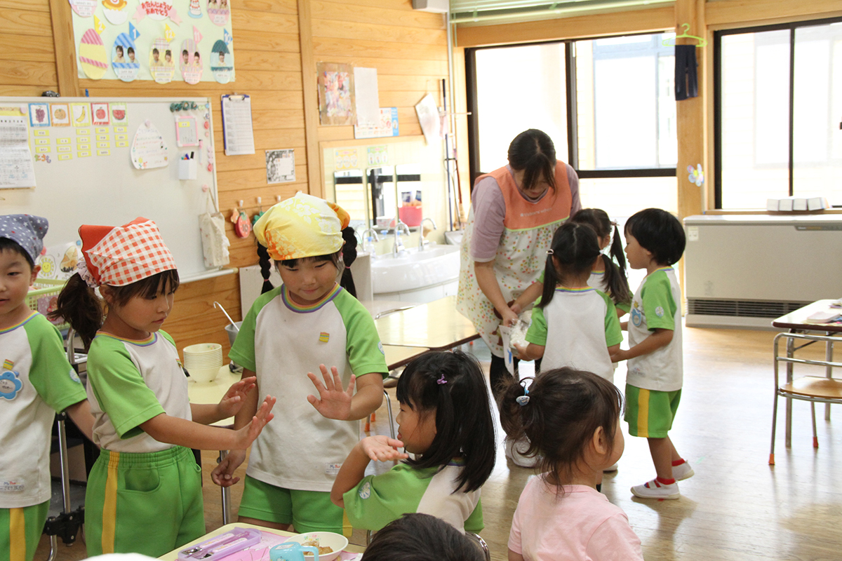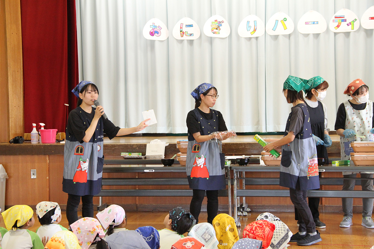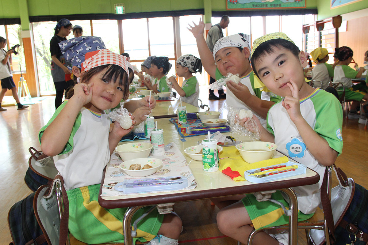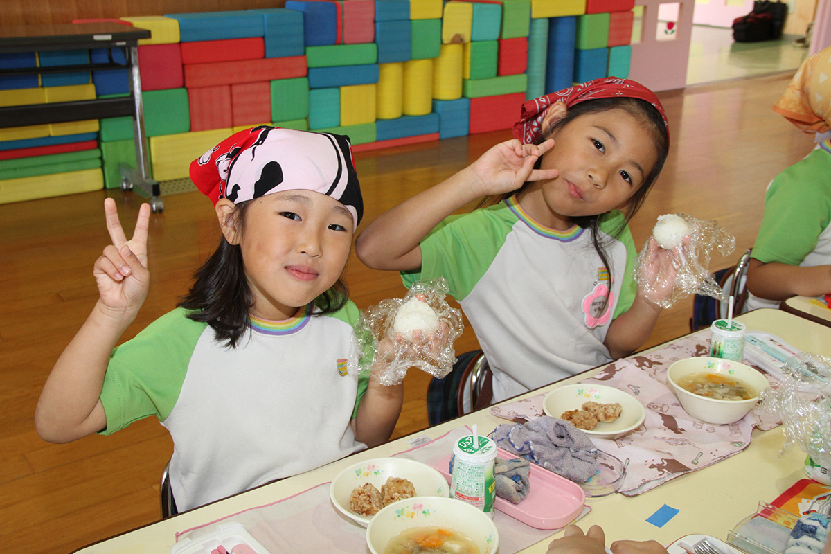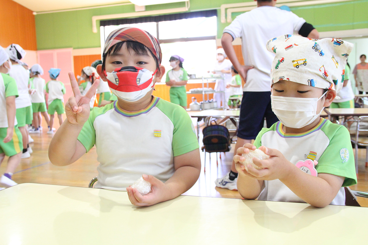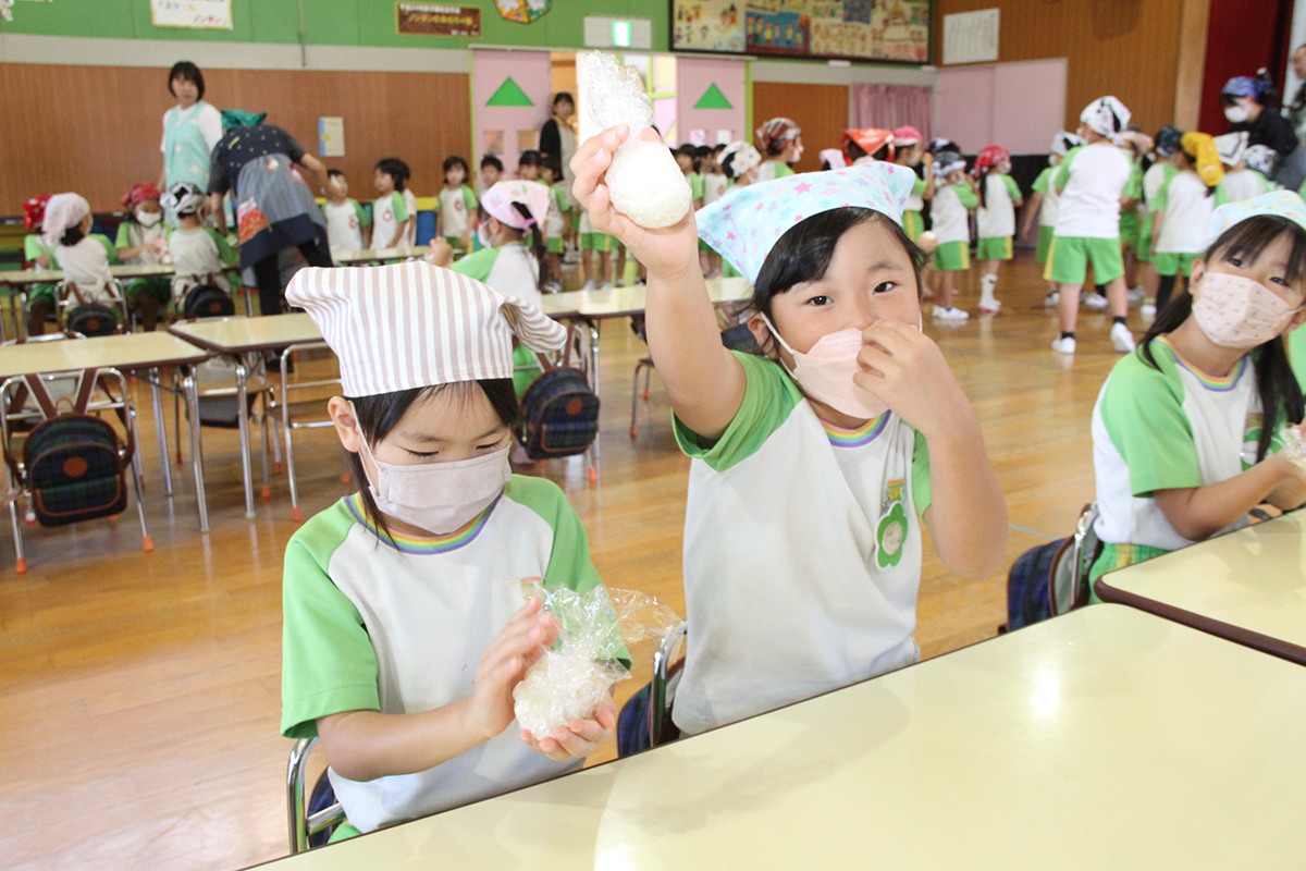 こども園に届けられた新米を使って、お楽しみの「おにぎりパーティー」を開催。