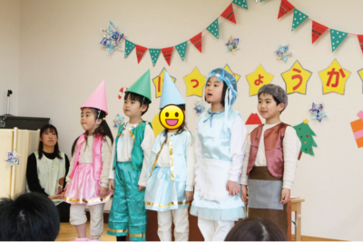 年長組の劇「こびとのくつや」では靴屋の店主とおかみさん、小人役をそれぞれが演じました。一人ひとりのセリフもぐっと増え、たくさんの練習の成果が見えました。心温まる物語に会場が穏やかな雰囲気に包まれました。