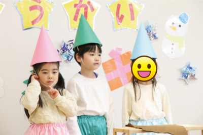 2歳児組の劇遊び「すてきな帽子屋さん」では、さまざまな帽子を被ってポーズをとる子どもたちの姿に保護者の方は目を細め、「かわいいね」と、笑みがこぼれていました。