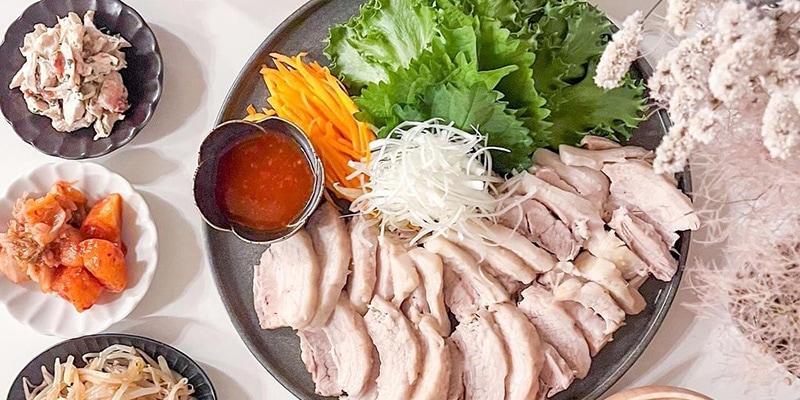 豚バラブロックをゆでたら、豆板醤や甜麺醤を合わせて韓国料理の「ポッサム」に。
