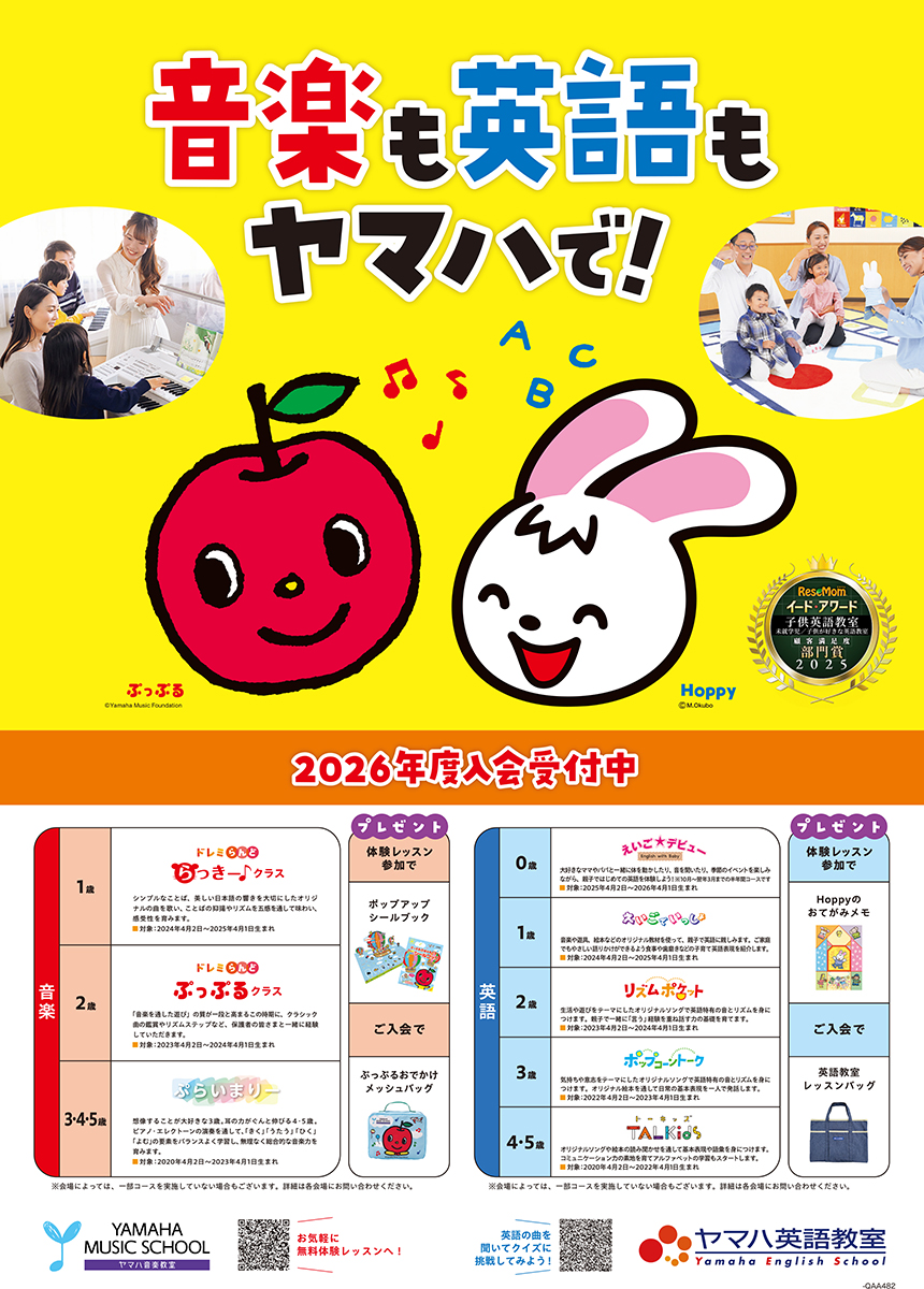 ヤマハ音楽教室・英語教室では2026年春開講クラス入会受付中です。