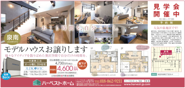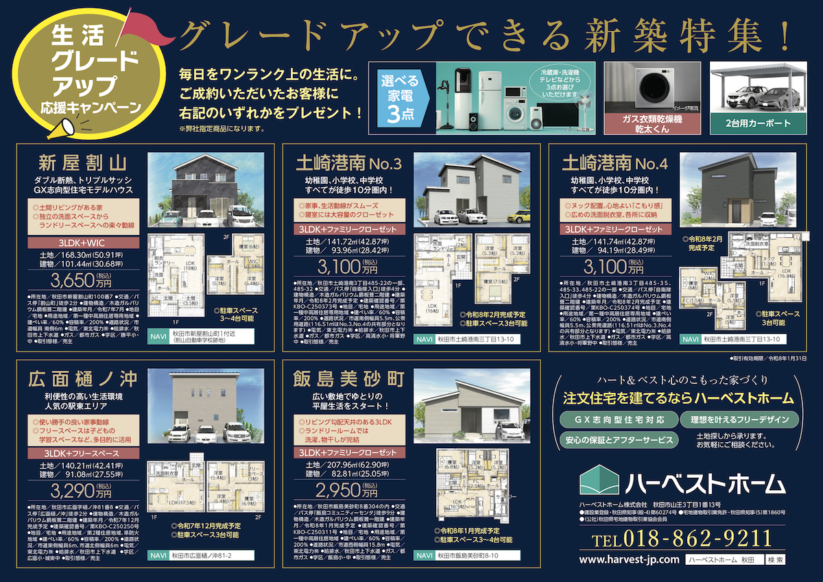 秋田で新築住宅を建てるなら、ハーベストホーム株式会社。秋田市およびその周辺エリア・大仙市大曲・横手市・由利本荘市・にかほ市などを中心にエリア展開しています。注文住宅、建売住宅、不動産売買や仲介などは、是非ハーベストホームへ。