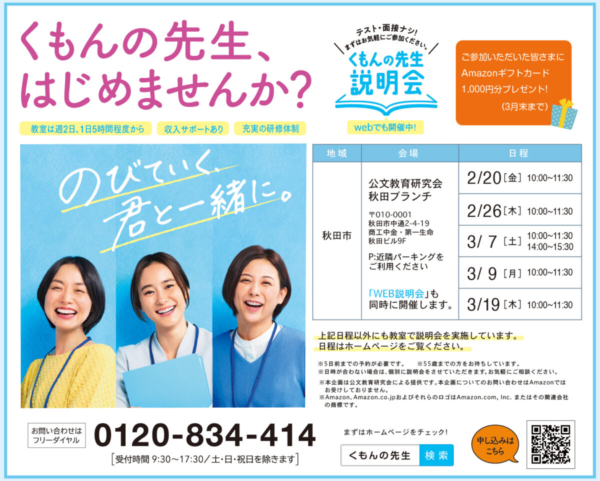 秋田会場では2月に2回、3月に3回説明会を開催します。 「WEB説明会」も同時開催します。