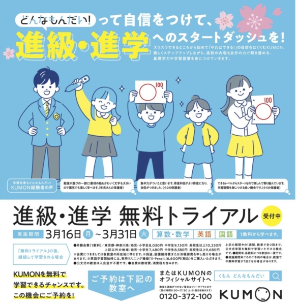 進級・進学の土台作りに、まずはKUMONの無料トライアルをご体感ください!