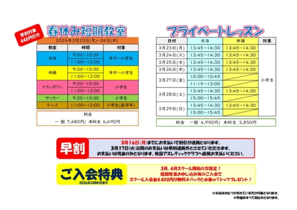 3月4月スクール開始の方限定。短期教室参加後のご入会で